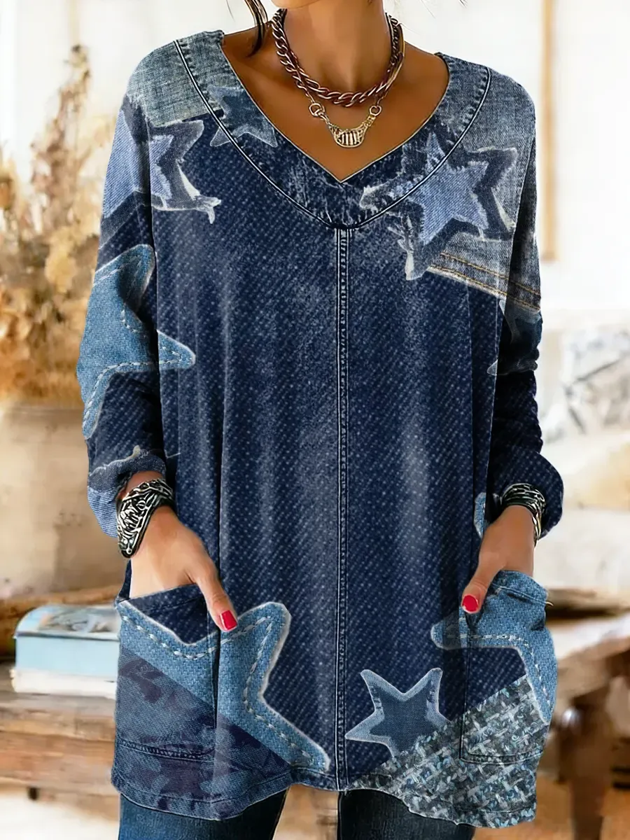Ethnicity Stars Patchwork Women's Art Print Casual Pocket Washed Denim Cotton Top