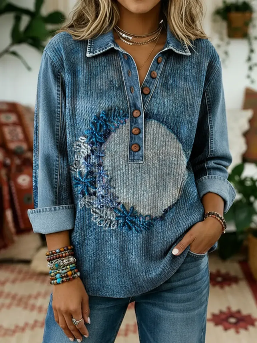 Ethnicity Texture Flowers Moon Women's Art Print Casual Denim Patchwork Shirt Coat