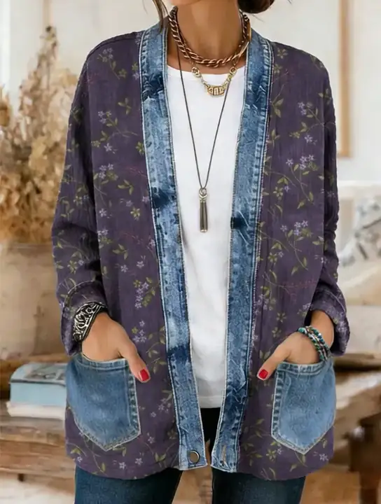 Vintage National Flower Art Women's Casual Long Sleeve Comfortable Denim Mix Cardigan