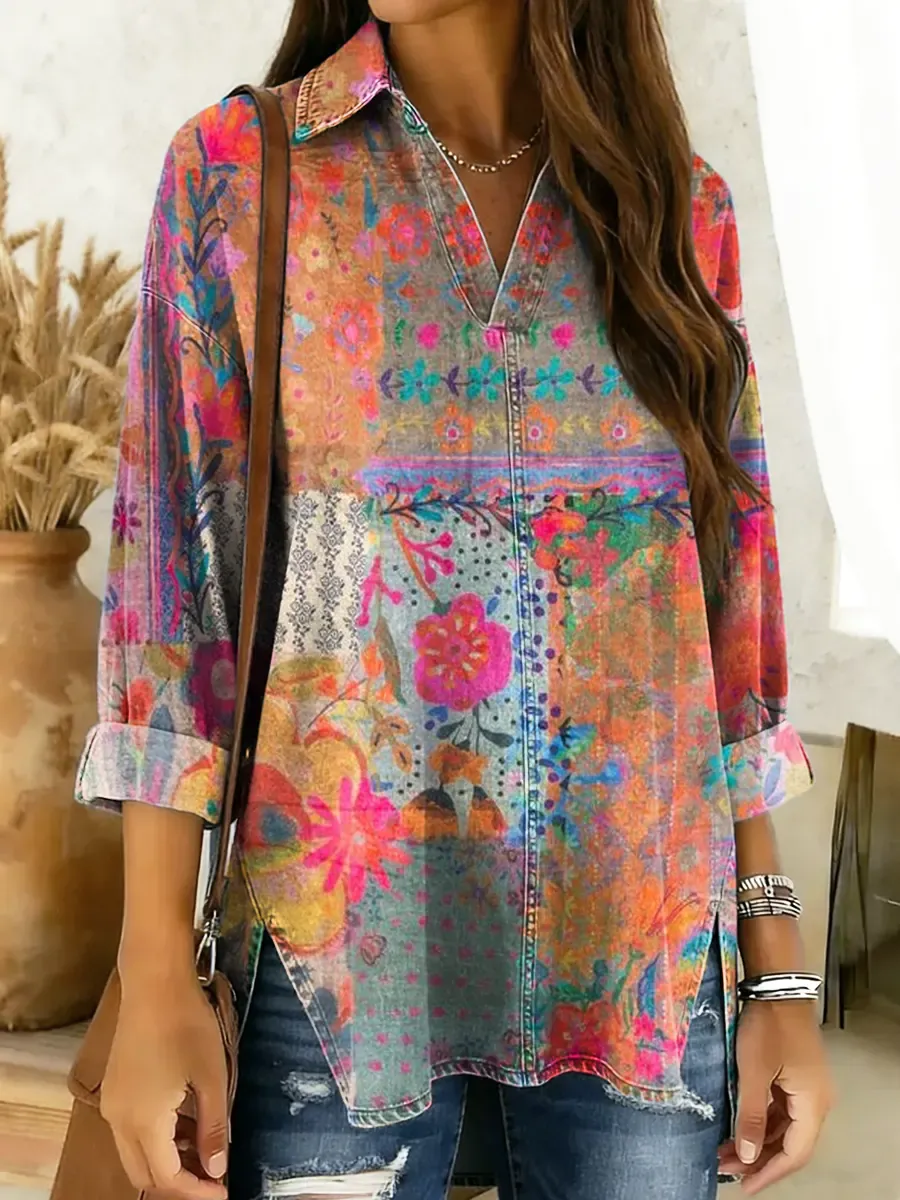 Women's Bohemian Floral Patchwork Art Print Washed Denim Cotton Shirt