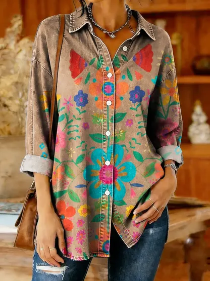 Women's Boho Floral Art Print Casual Denim Cotton Shirt