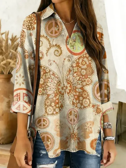 Women's Butterfly Hippie Peace Art Print Washed Denim Cotton Shirt