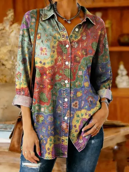 Women's Colorful Floral Wave Collage Art Print Casual Denim Cotton Shirt
