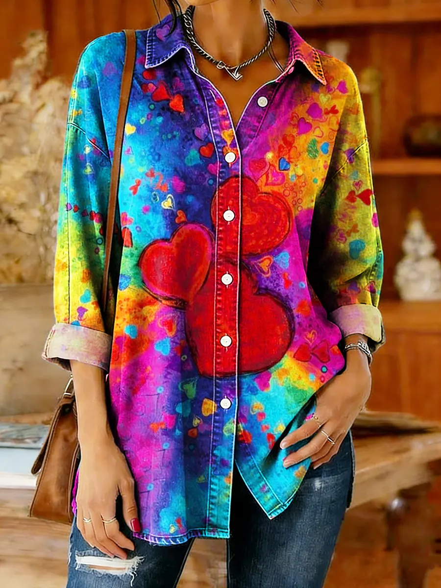 Women's Colorful Tie-dye Heart Art Print Casual Denim Cotton Shirt