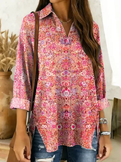 Women's Ethnic Floral Art Print Washed Denim Cotton Shirt