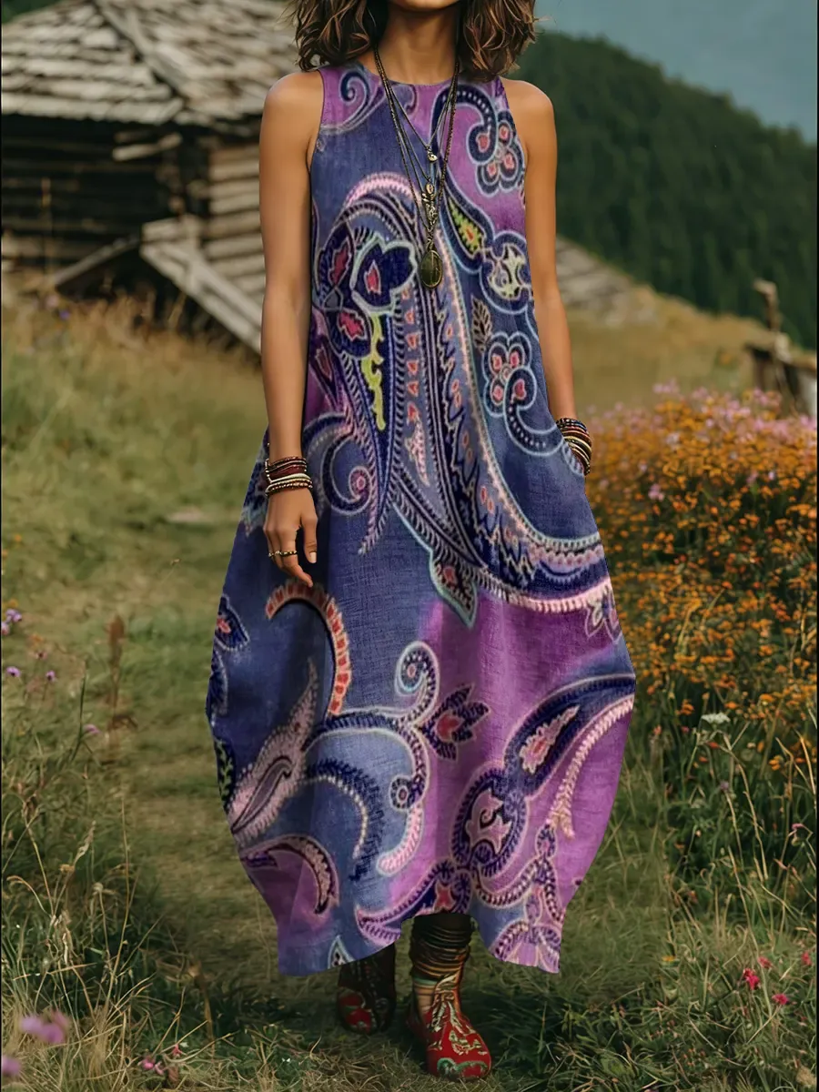 Women's Ethnic Paisley Art Print Round Neck Sleeveless Cotton Pocket Dress