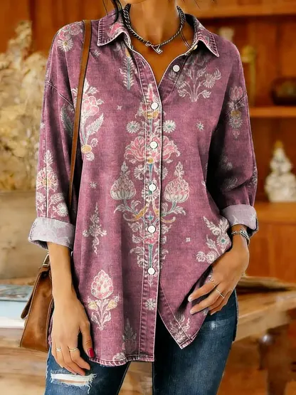 Women's Floral Art Print Casual Denim Cotton Shirt