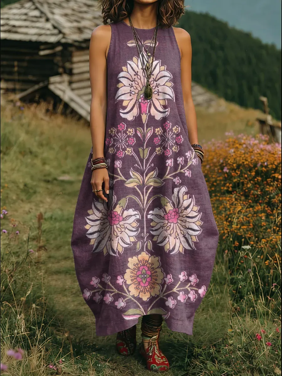 Women's Floral Art Print Round Neck Sleeveless Cotton Pocket Dress