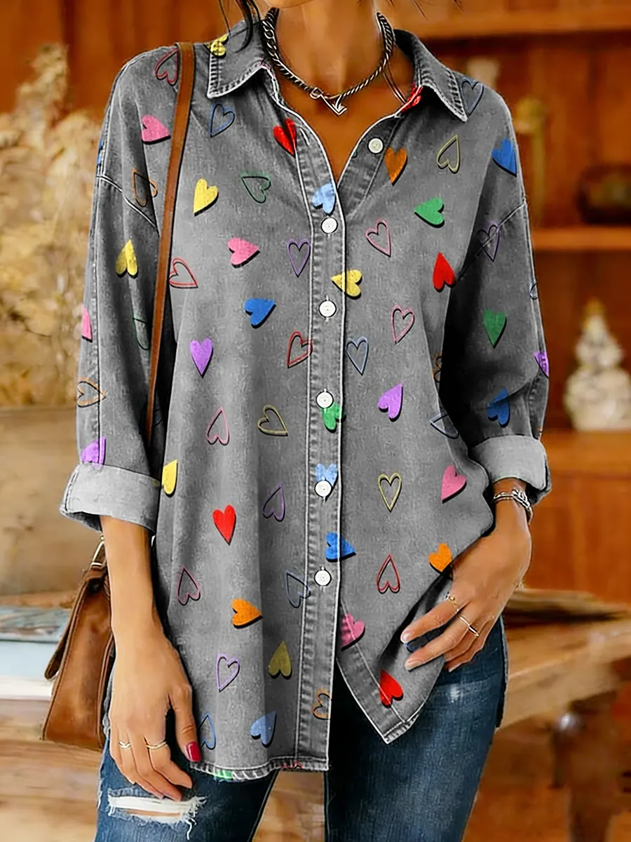 Women's Heart Shape Art Print Casual Denim Cotton Shirt