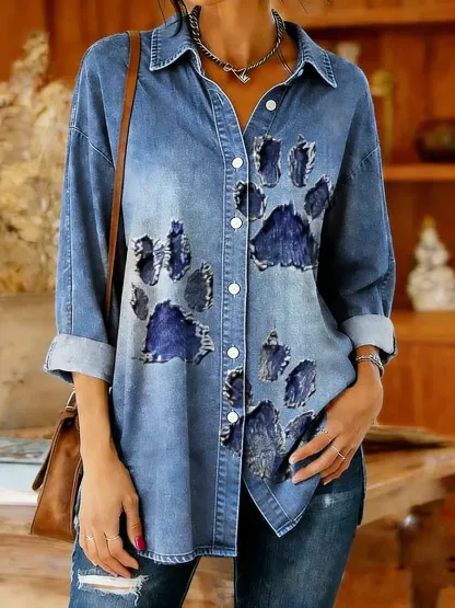 Women's Paw Art Print Casual Denim Cotton Shirt