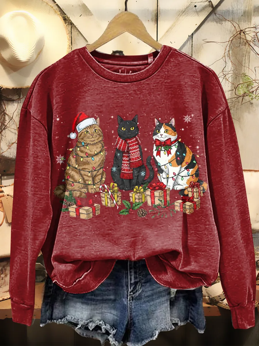 Women's Retro Christmas Art Print Casual Long Sleeve Crew Neck Sweatshirt