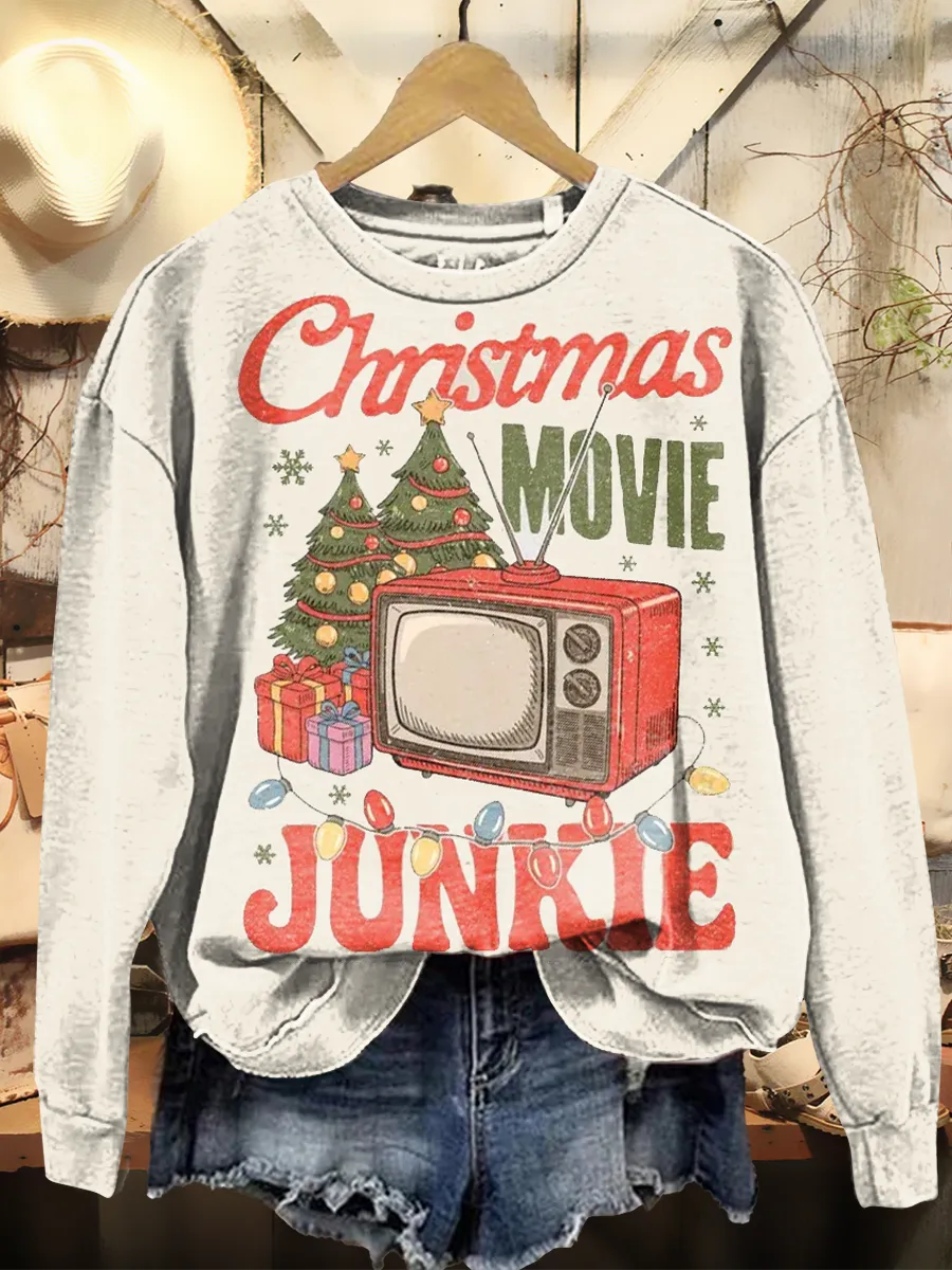 Women's Retro Christmas Art Print Casual Long Sleeve Crew Neck Sweatshirt