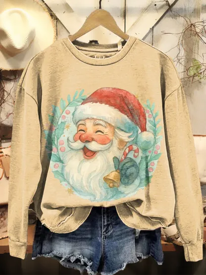 Women's Retro Christmas Art Print Casual Long Sleeve Crew Neck Sweatshirt
