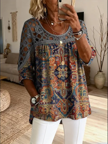 Women's Retro Ethnic Totem Art Print Casual Three-quarter Sleeve Round Neck Hollow-out Top