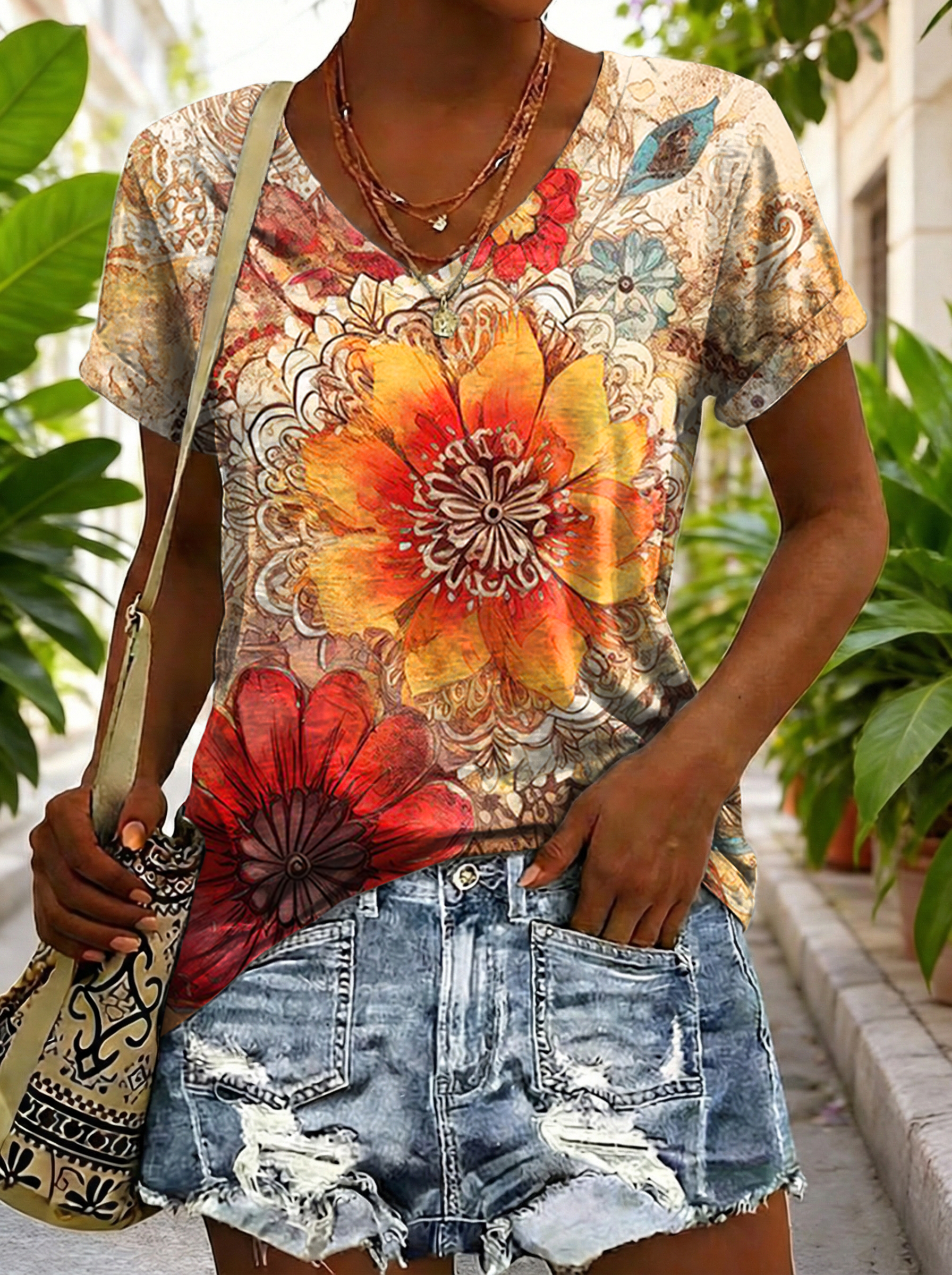 Women's Retro Floral Art Print Casual Short-Sleeve V-Neck Cotton T-Shirt