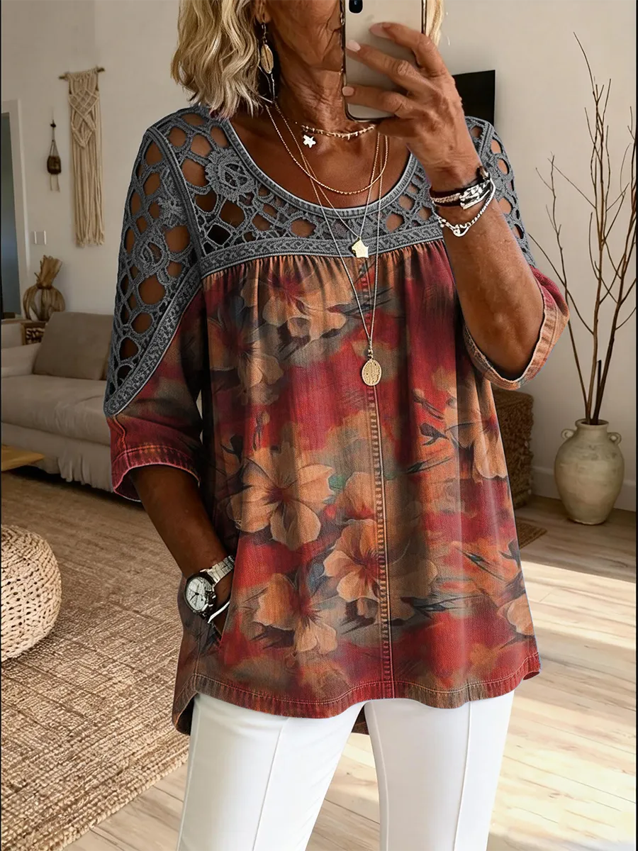 Women's Retro Floral Art Print Casual Three-quarter Sleeve Round Neck Hollow-out Top