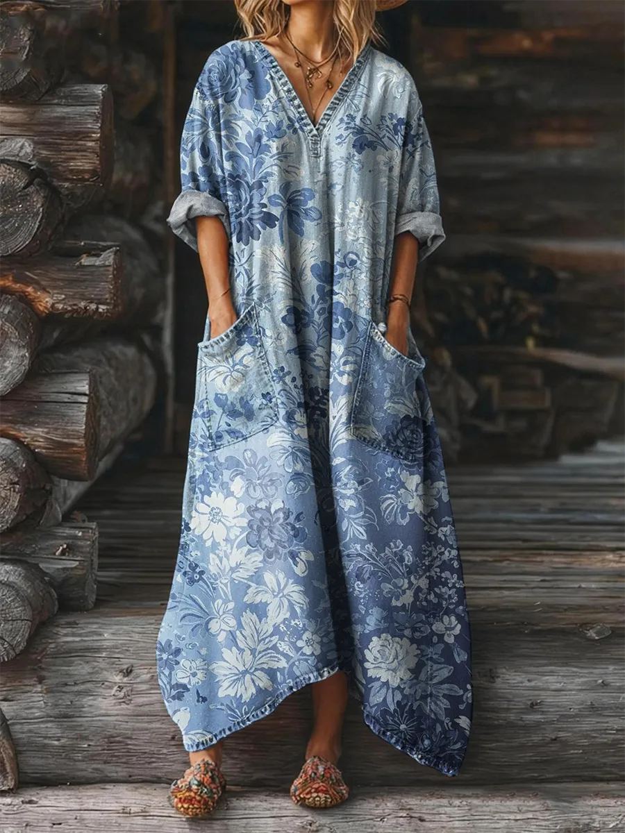 Women's Retro Floral Gradient Art Print Casual Long-Sleeve V-Neck Pocket Washed Cotton Denim Dress
