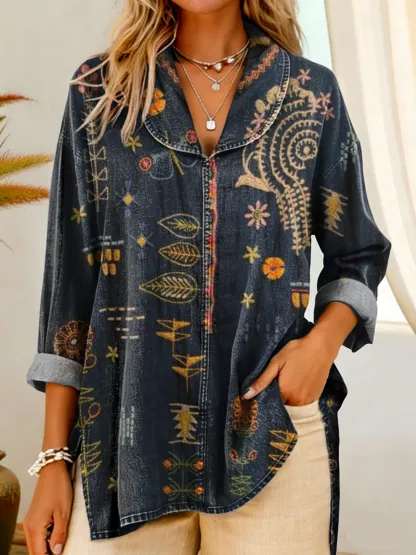 Womens Vintage Ethnic Blue Patterned Art Printed Collar Long Sleeve Denim Cotton Shirt