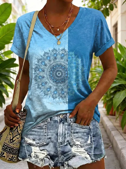 Women's Vintage Ethnic Blue Totem Art Print Casual V-neck Short Sleeve Cotton T-shirt