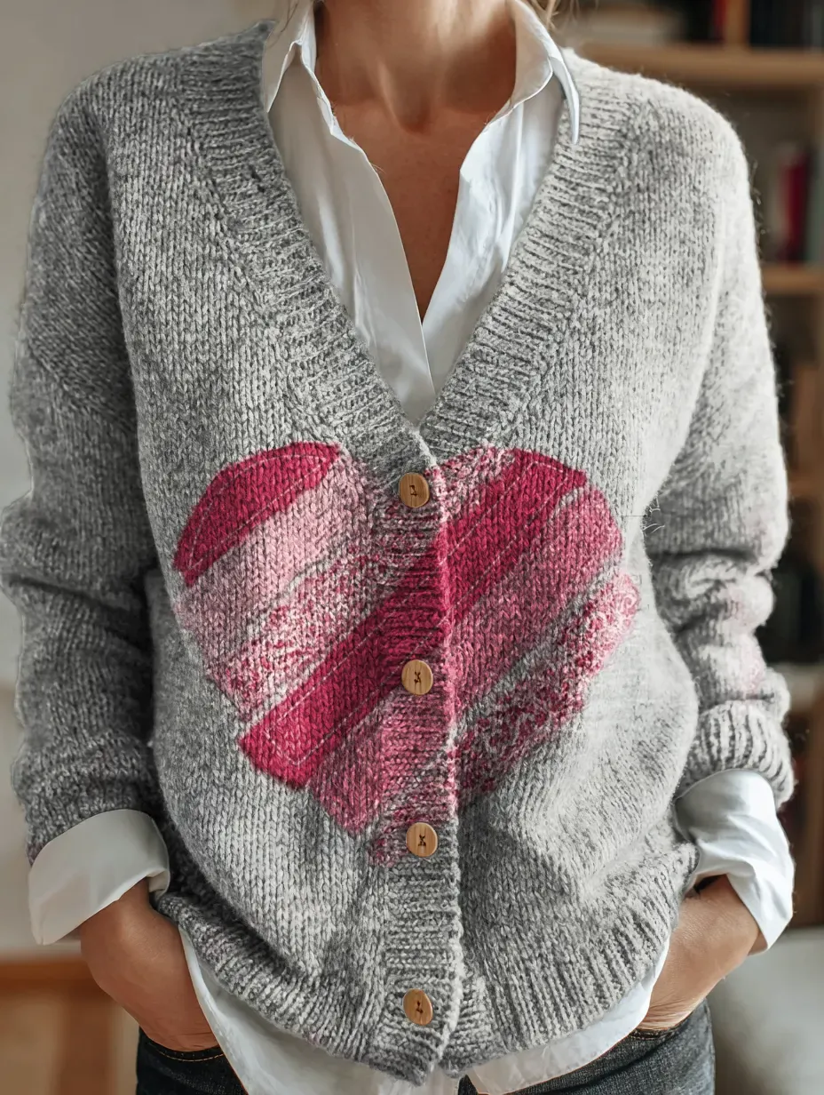 Women's Vintage Pink Patchwork Heart Art Print Button-up V-neck Cardigan Sweater