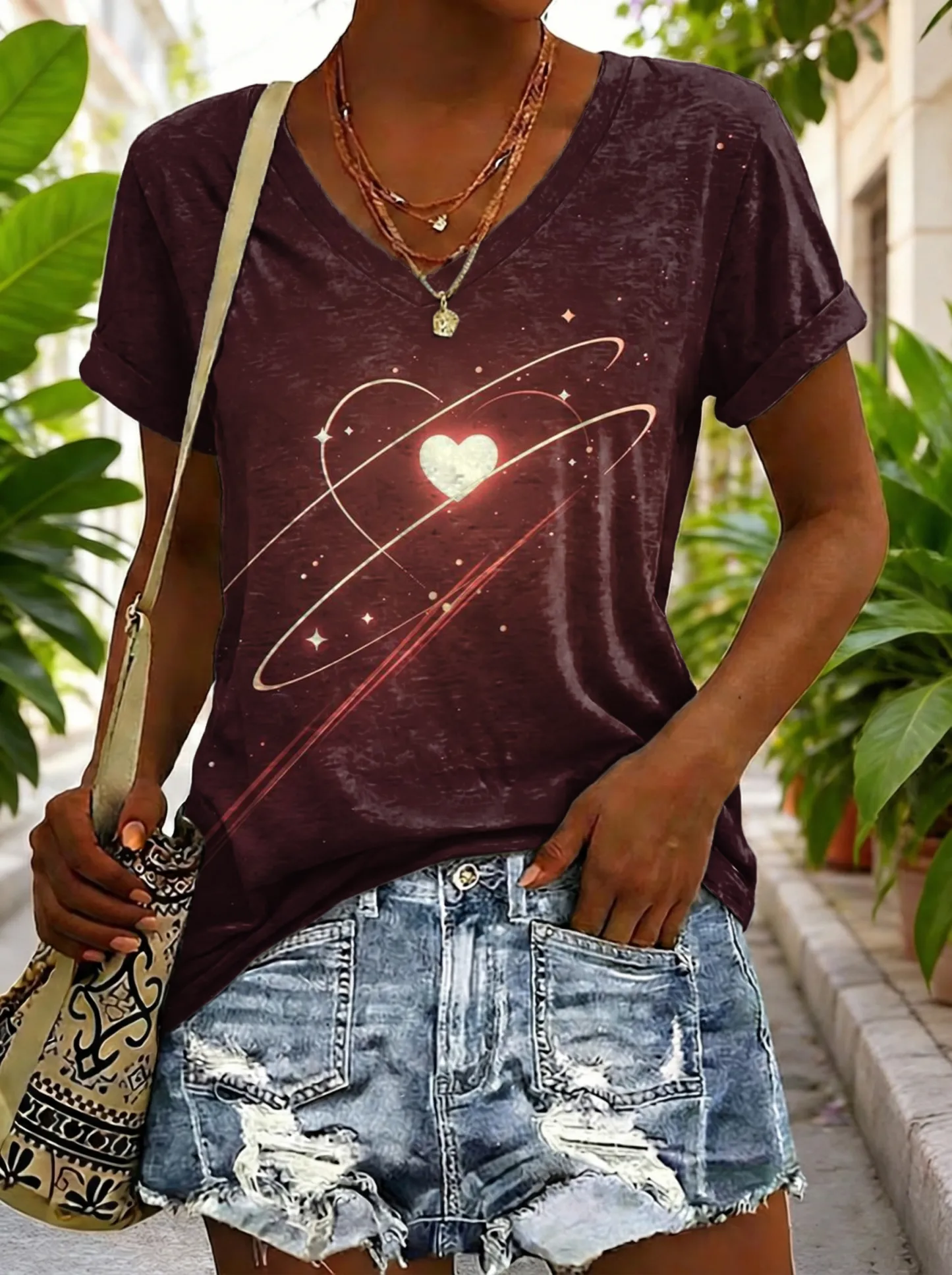 Women's Vintage Red Heart Art Print Casual V-neck Short Sleeve Cotton T-shirt