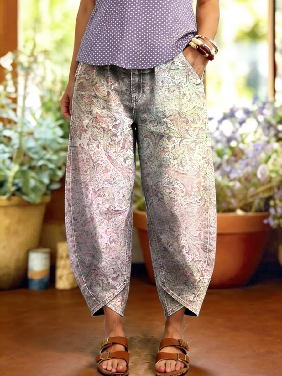 Women's Vintage Textured Floral Art Print Casual Cotton Denim Jeans