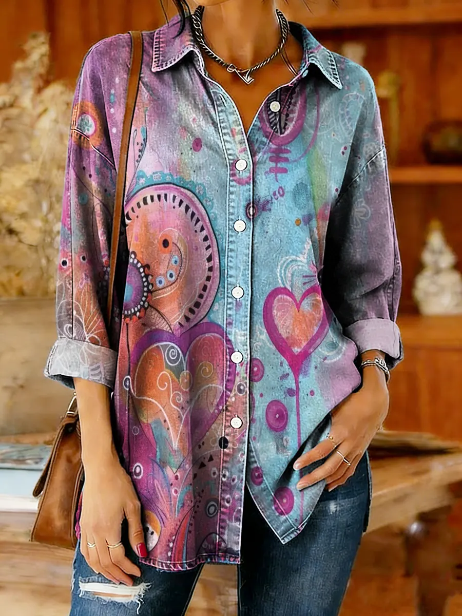 Women's Watercolor Floral Art Print Casual Denim Cotton Shirt