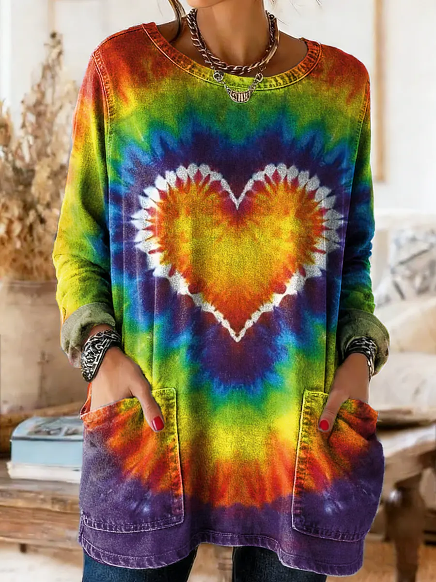 Ethnicity Colorful Love Tie Dye Women's Casual Long-sleeve Crew Neck Pocket Washed Cotton Denim T-shirt