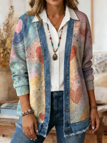 Ethnicity Love Women's Art Print Casual Denim Patchwork Knit Sweater Coat