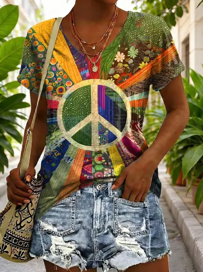 Hippie Ethnicity Patchwork Flowers Women's V-neck Print Casual T-shirt