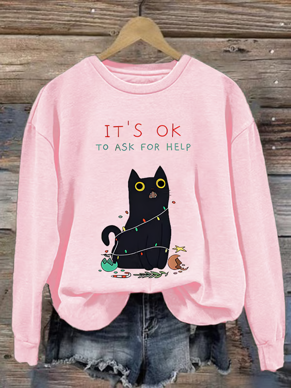 It's Ok To Ask For Help Christmas Cat Print Casual Sweatshirt