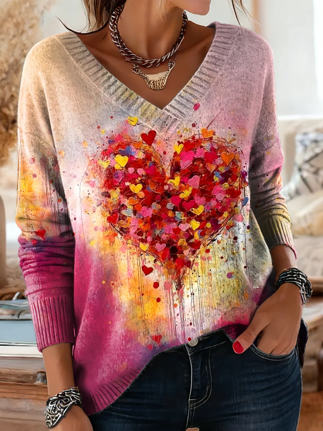 Women's Heart Graffiti Gradient Art Prints Casual V-neck Long Sleeve Knit Sweater