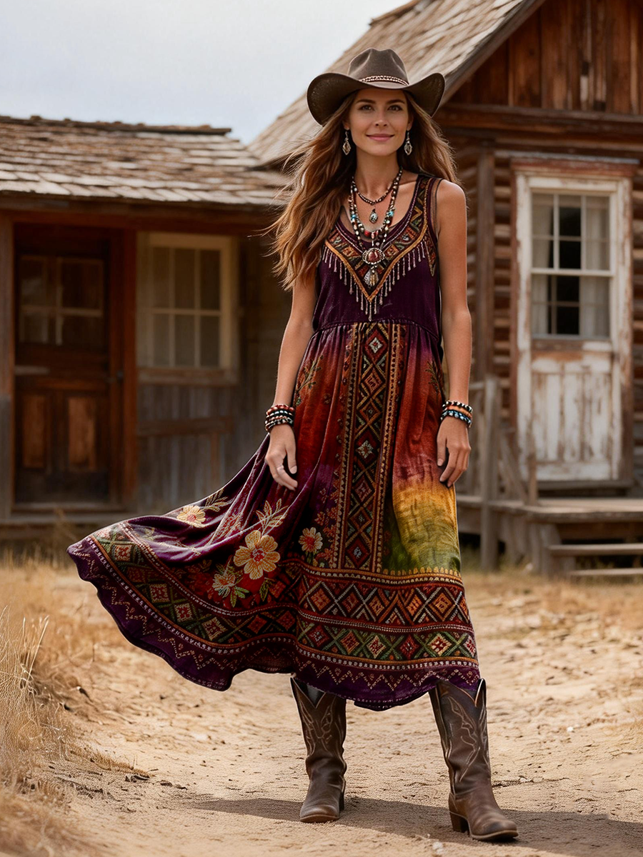 Women's Retro Bohemian Ethnic Art Print Casual Sleeveless Round Neck Cotton Dress