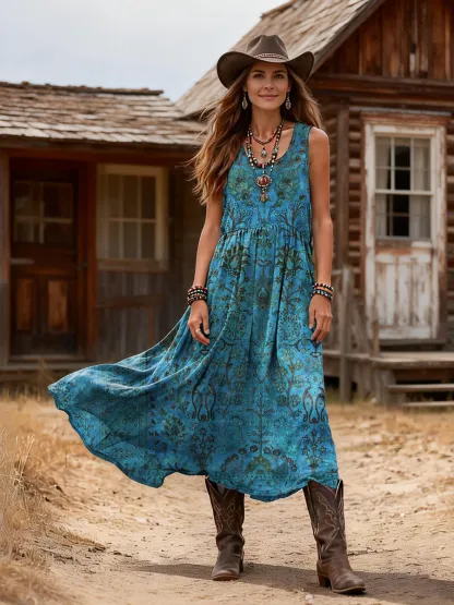 Women's Retro Ethnic Totem Art Print Casual Sleeveless Round Neck Cotton Dress