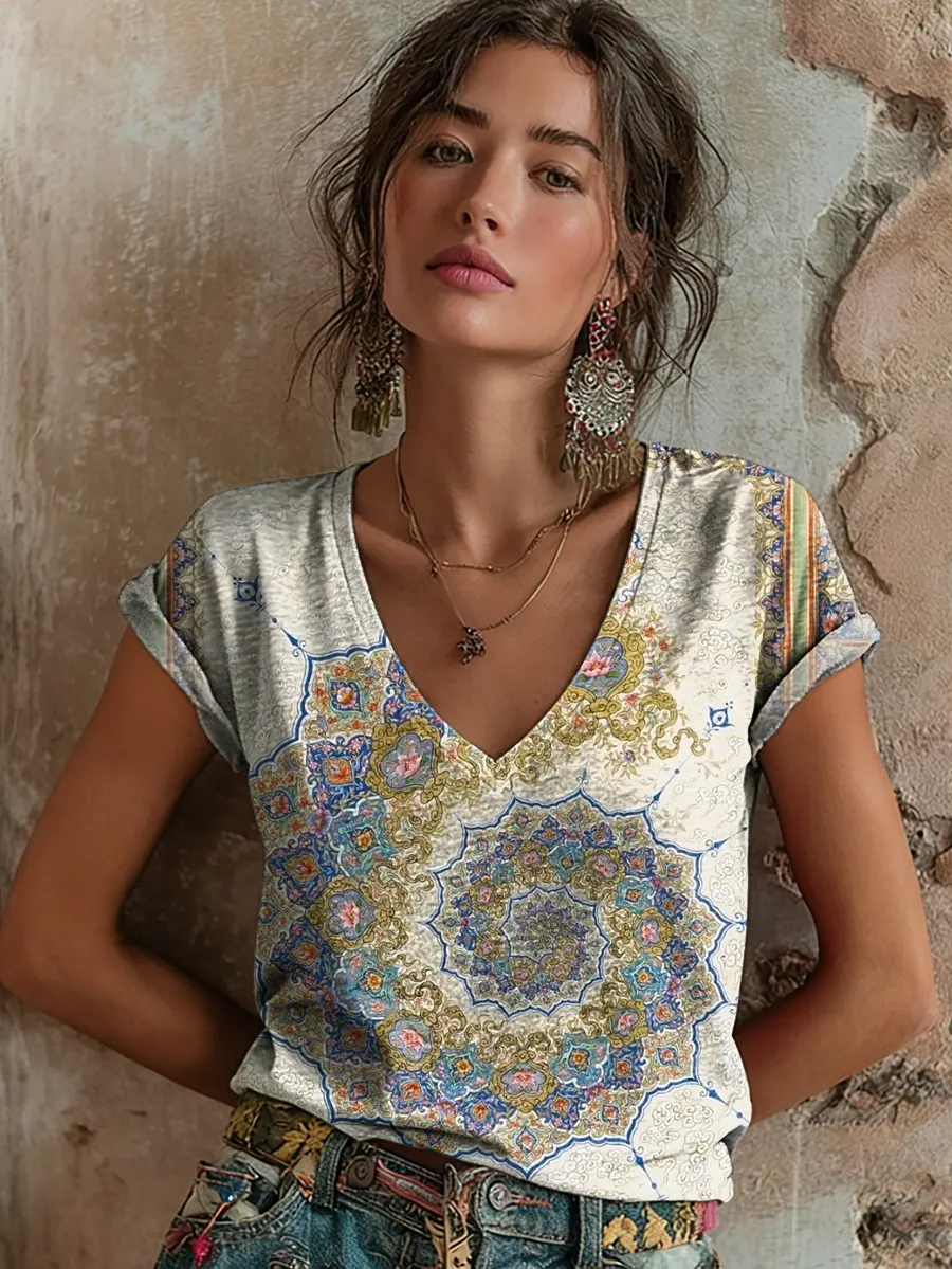 Women's Totem Ethnic Floral Art Print V-neck T-shirt