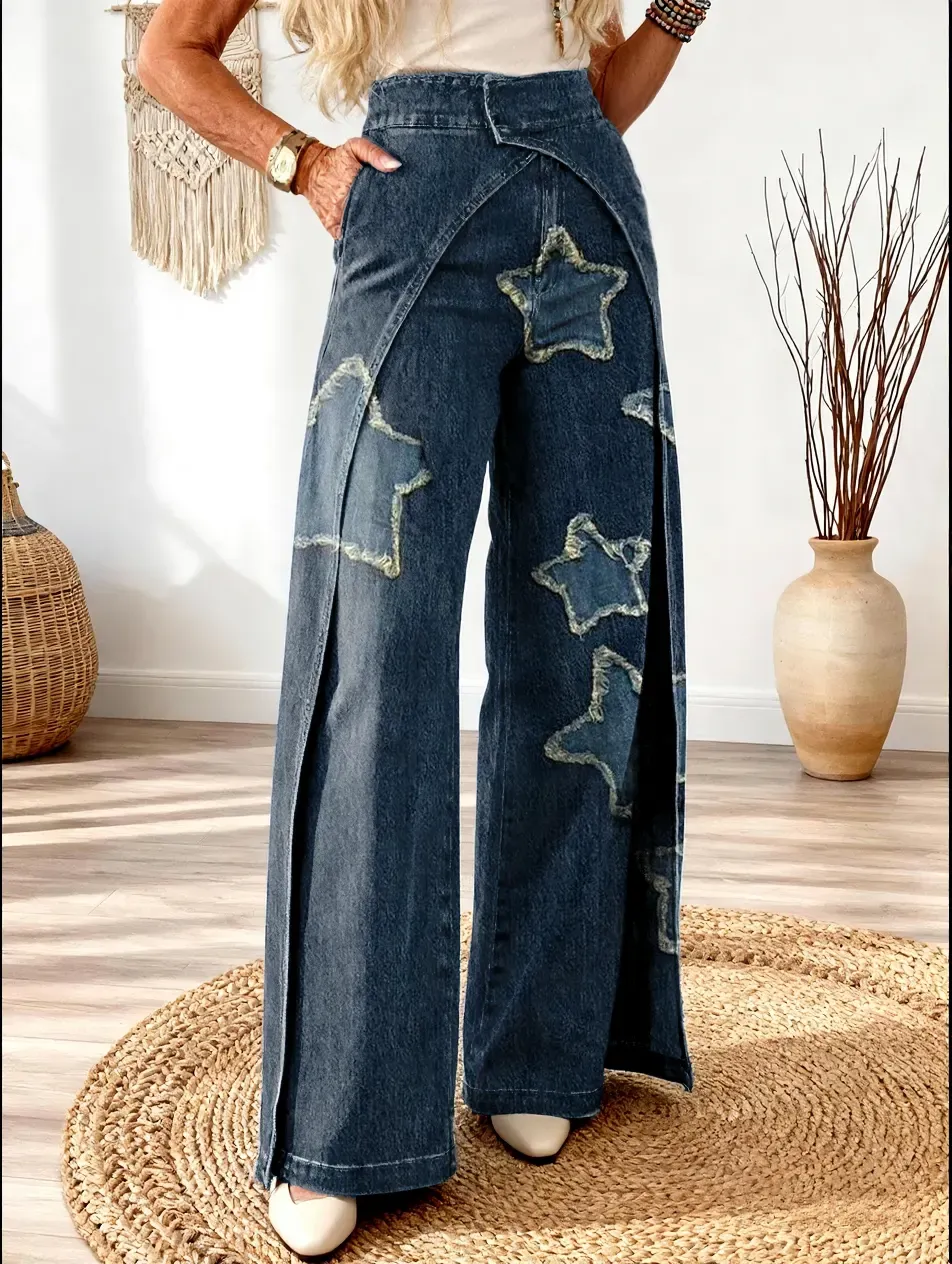 Women's Vintage Star-patterned Textured Pattern Art Print Casual Washed Cotton Denim Jeans