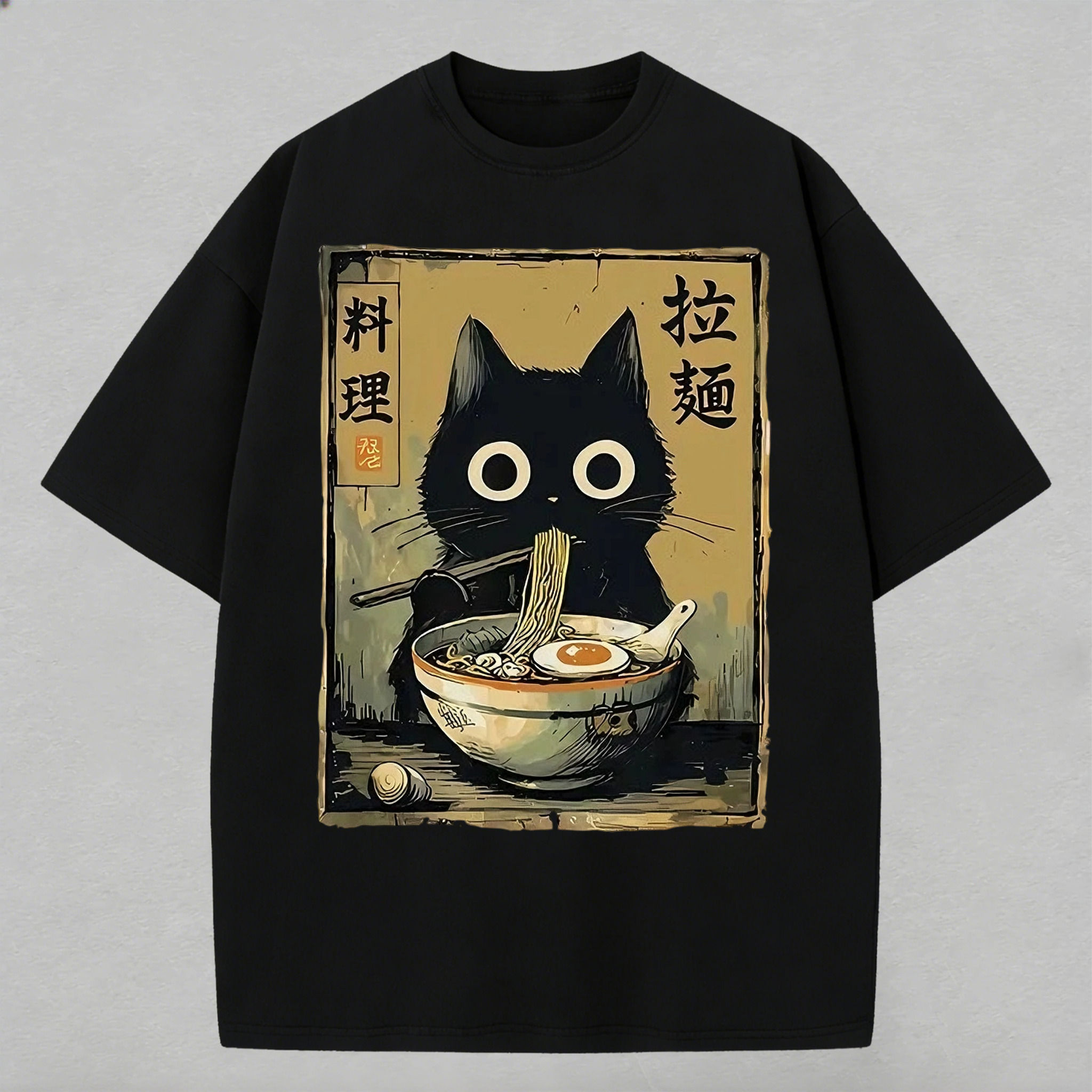 Cute Black Cat Ramen Japan Printed Oversized T-shirt