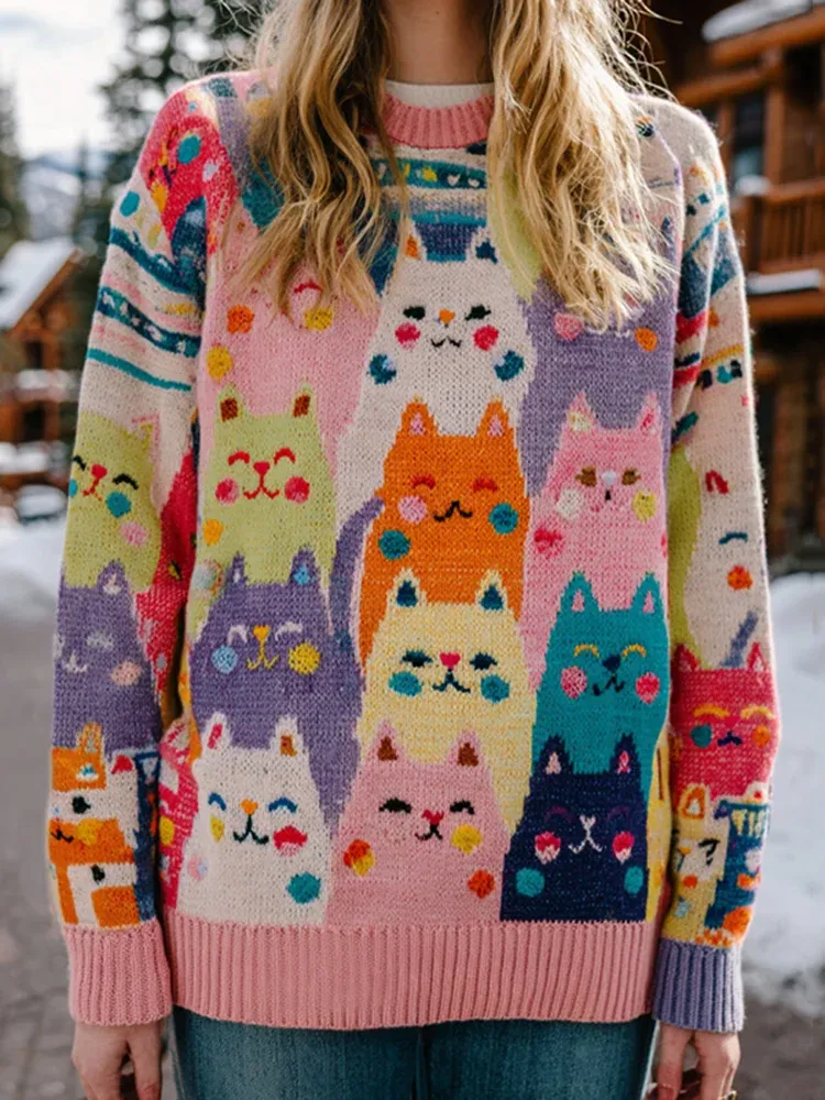 Women's Funny Cats Art Print Casual Knit Sweater