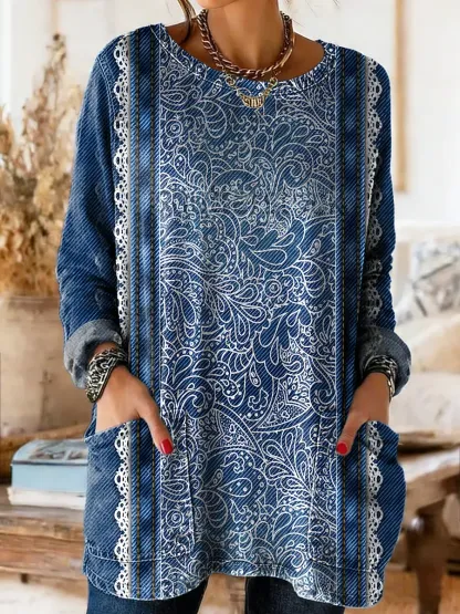 Ethnicity Geometry Flowers Patchwork Women's Casual Long-sleeve Crew Neck Pocket Washed Cotton Denim T-shirt