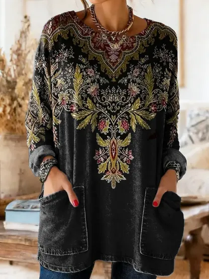 Retro Ethnicity Totem Women's Casual Long-sleeve Crew Neck Pocket Washed Cotton Denim T-shirt