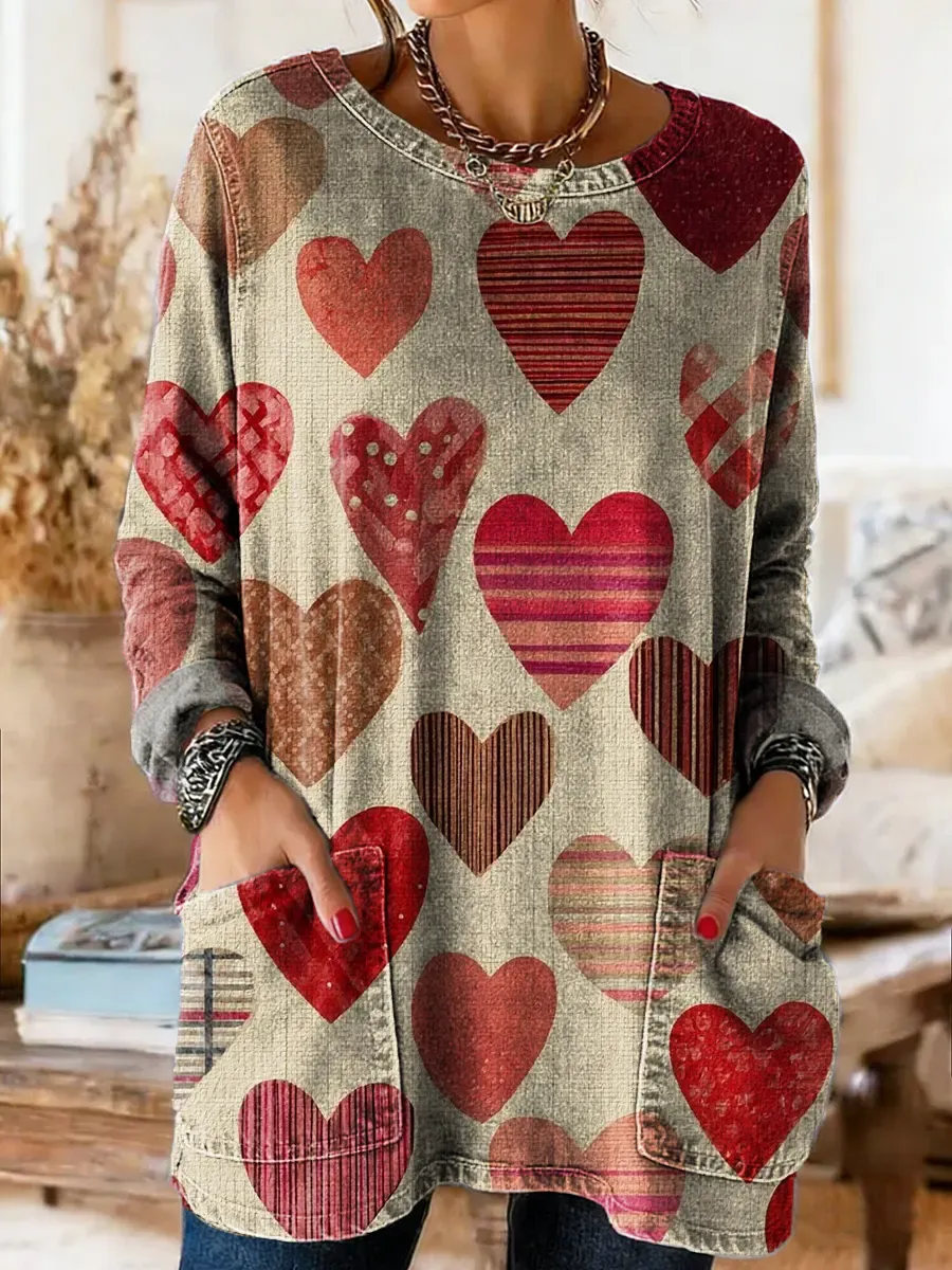 Retro Stripes Geometry Love Women's Casual Long-sleeve Crew Neck Pocket Washed Cotton Denim T-shirt
