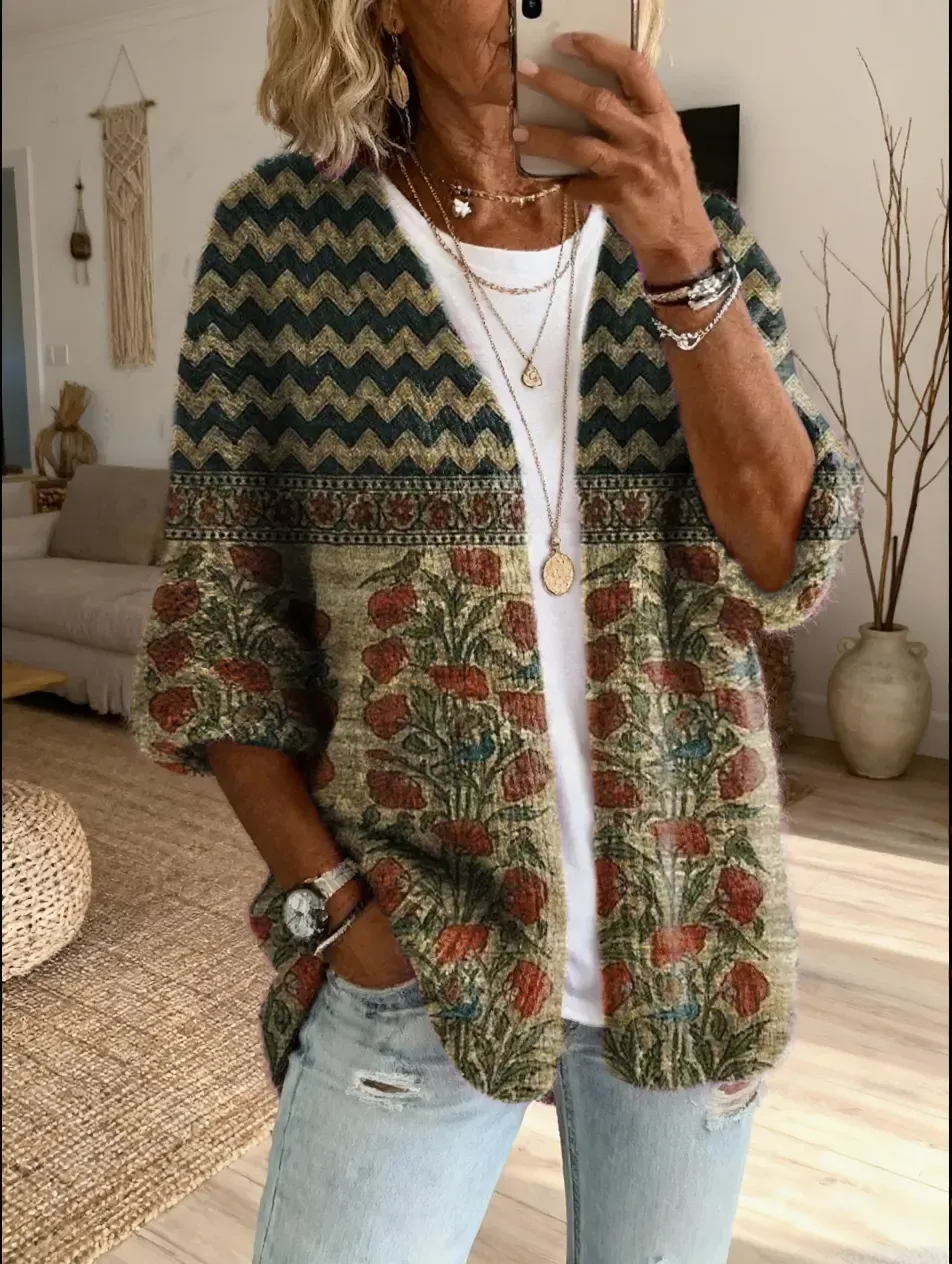 Women's Retro Bohemian Floral Art Print Casual Cardigan Sweater