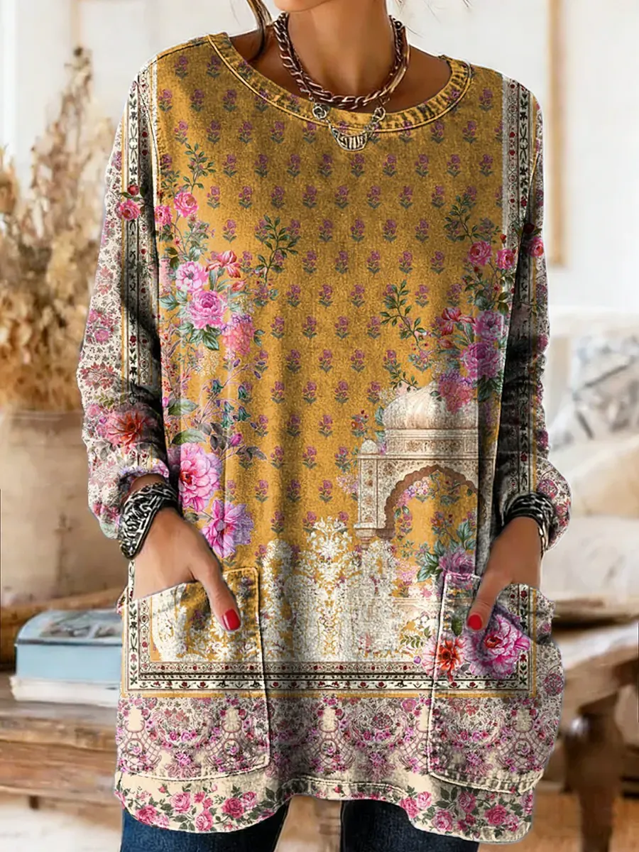 Women's Vintage Ethnic Pattern Art Print Casual Long-sleeve Crew Neck Pocket Cotton Denim T-shirt