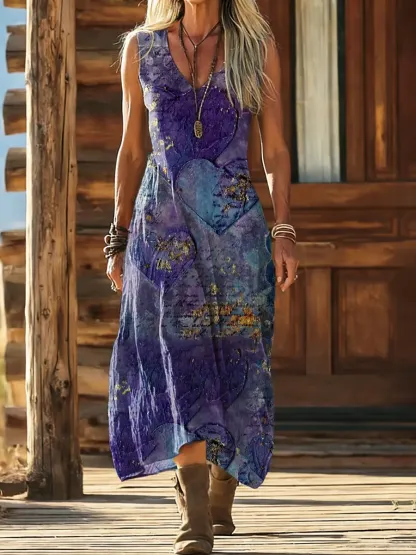 Women's Vintage Heart-pattern Art Print Sleeveless V-neck Dress With Pockets