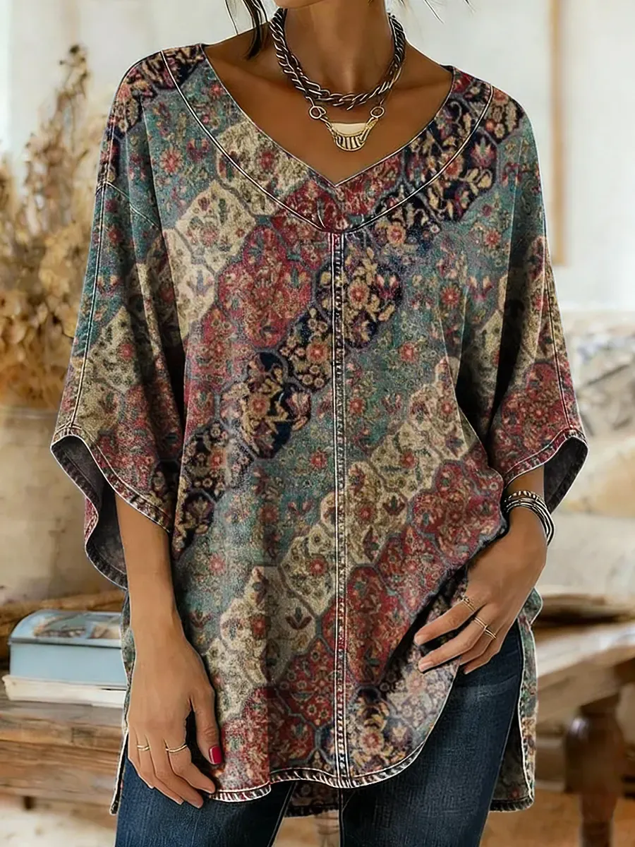Ethnicity Flowers Geometry Women's Art Print Casual Washed Denim Cotton Top