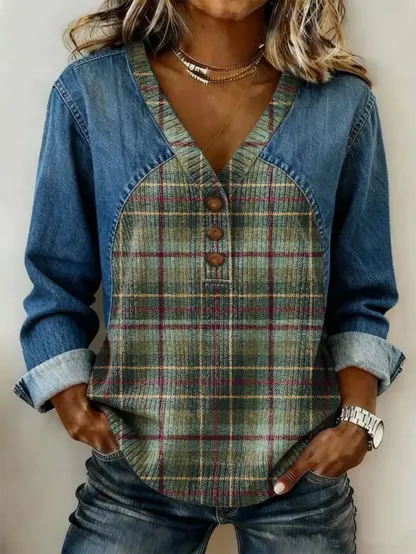 Ethnicity Green Check Pattern Women's Retro Casual Denim Patchwork Cotton Knit Sweater