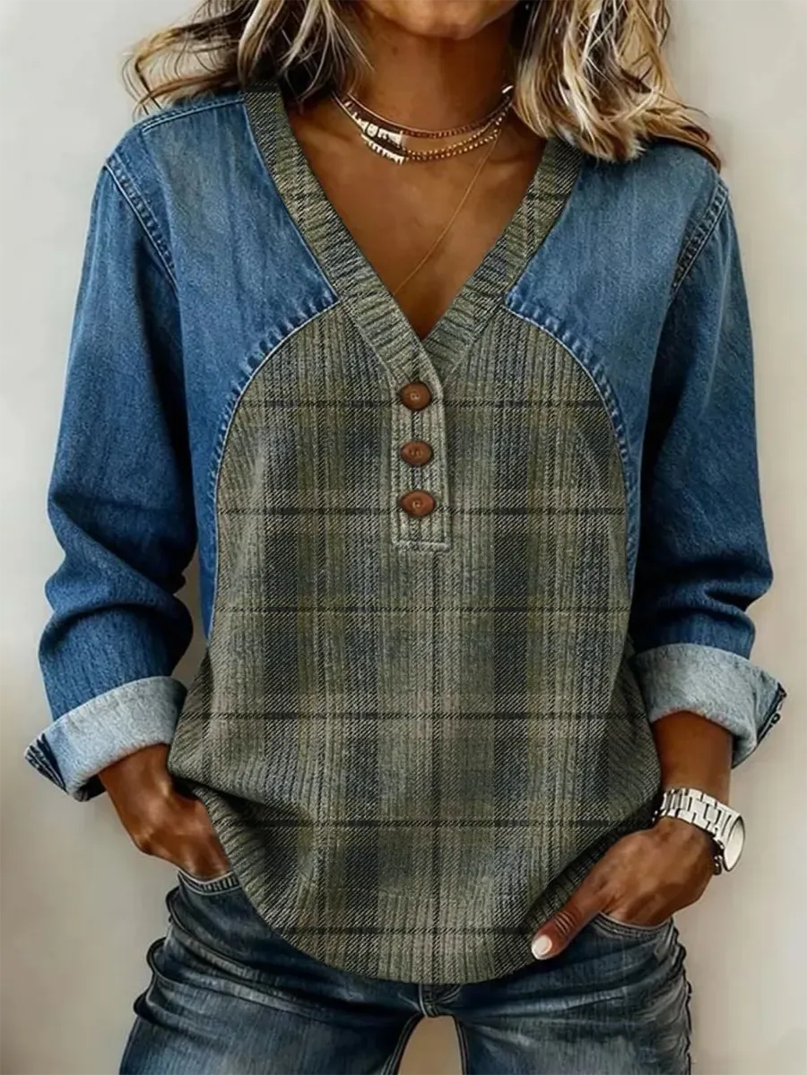 Ethnicity Green Checkered Art Women's Retro Casual Denim Patchwork Cotton Knit Sweater