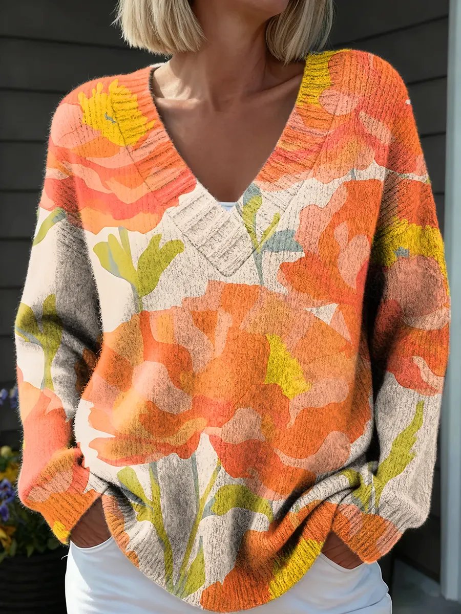Ethnicity Orange Flowers Women's Print V-neck Long Sleeve Sweater
