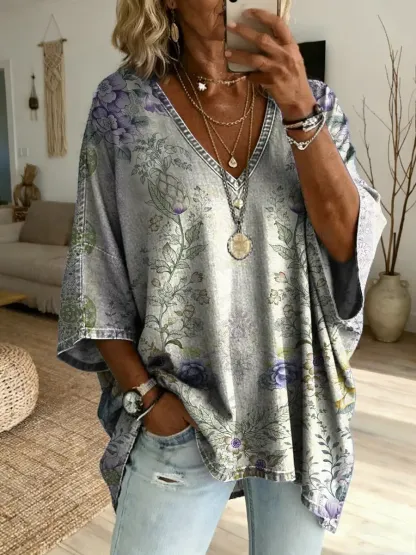 Ethnicity Purple Flowers Women's Art Print Casual Washed Cotton Denim Top