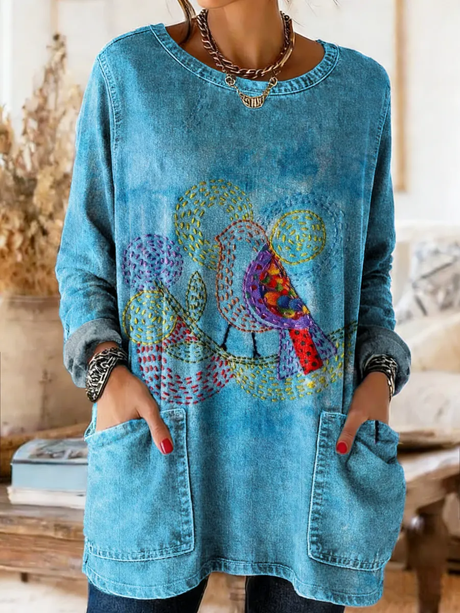 Women's Art Print Casual Long-sleeve Crew Neck Pocket Cotton Denim T-shirt With Bird Pattern